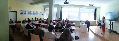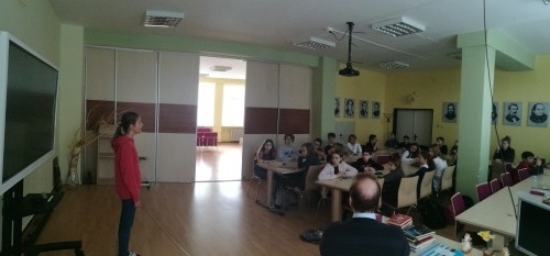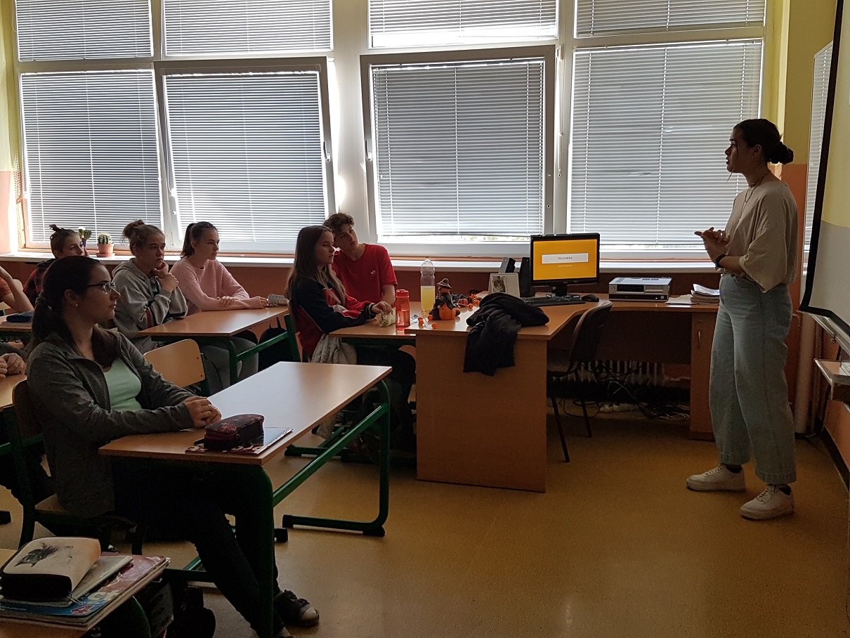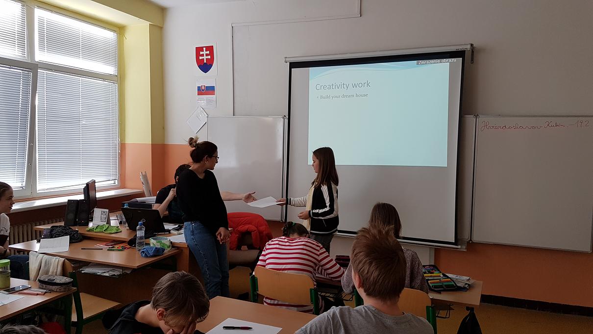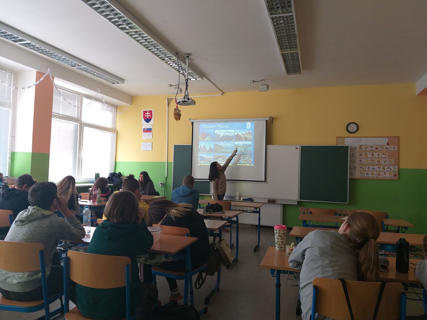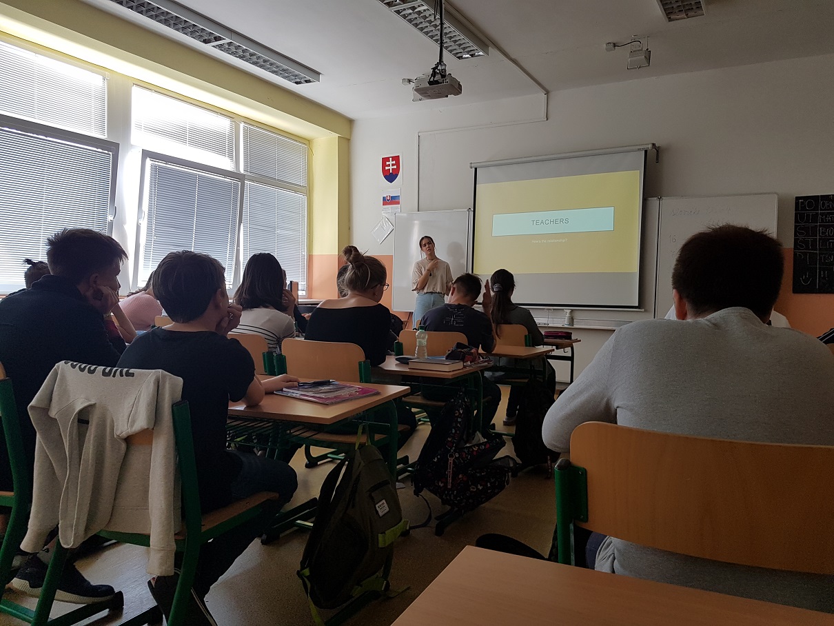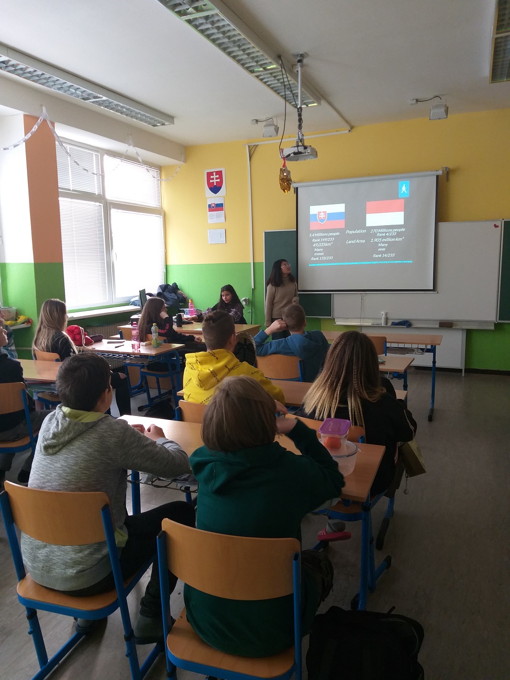 Geografii sa týkala najmä úvodná prezentácia, ktorú si pani Komastu pripravila pre žiakov siedmeho ročníka a ktorá okrem všeobecných geografických údajov prinášala tiež pohľad na priemysel a kultúru Japonska. Porozprávala im o japonskom školstve. Pani kultúrna atašé priniesla žiakom ukážky textov písaných v japončine a typické japonské oblečenie. Po nej nasledovala voľná diskusia, v rámci ktorej pani atašé odpovedala na zvedavé otázky žiakov. Žiaci boli milo prekvapení, že pani Komastu rozumie a hovorí po slovensky. Priznala sa deťom, že slovenčina je ťažký jazyk a pri jeho učení sa veľmi potrápila.