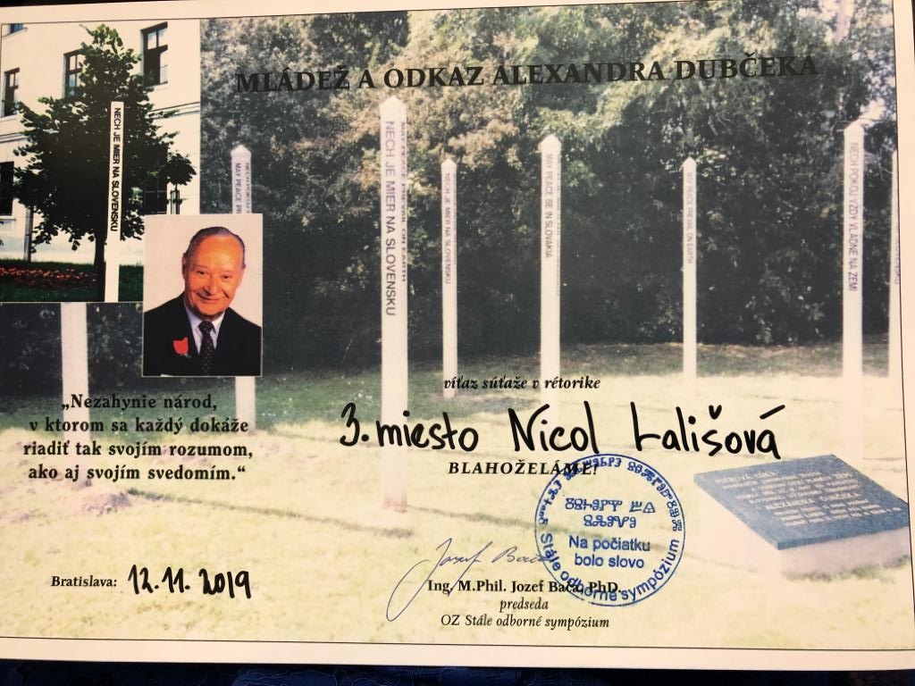 Dňa 27.11.2020 sa uskutočnilo okresné kolo Olympiády zo slovenského jazyka, ktoré sa tento rok konalo online formou. Našu školu v tejto súťaži reprezentovala žiačka z 9.A triedy Michaela Miriam Chorvátová. Aj napriek nepriaznivej situácii a výrazne sťaženým podmienkam sa Miška umiestnila na krásnom prvom mieste, a tým získala postup na Krajské kolo Olympiády zo slovenského jazyka.