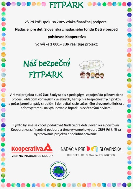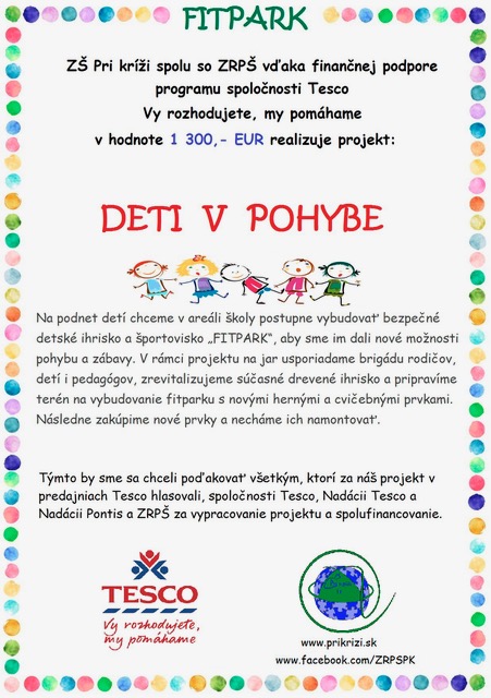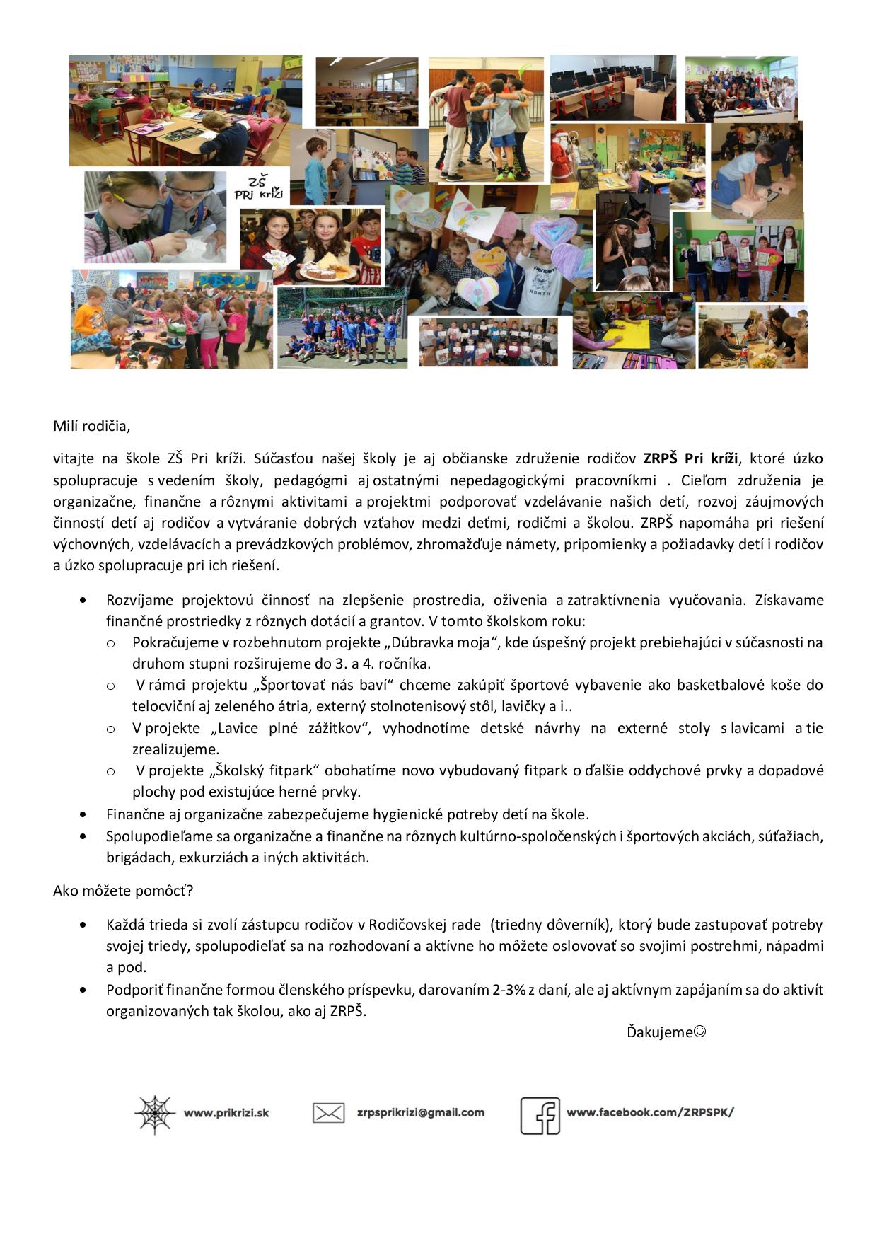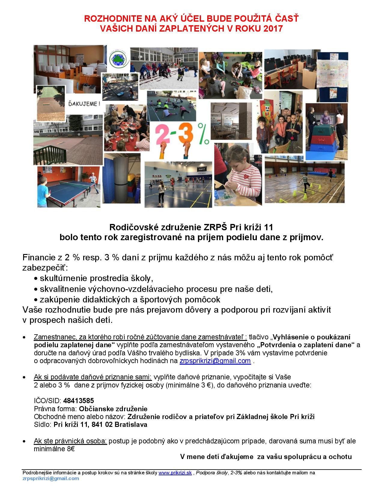 Naše rodičovské združenie ZRPŠ Pri kríži 11 bolo tento rok opäť zaregistrované na príjem podielu dane z príjmu.