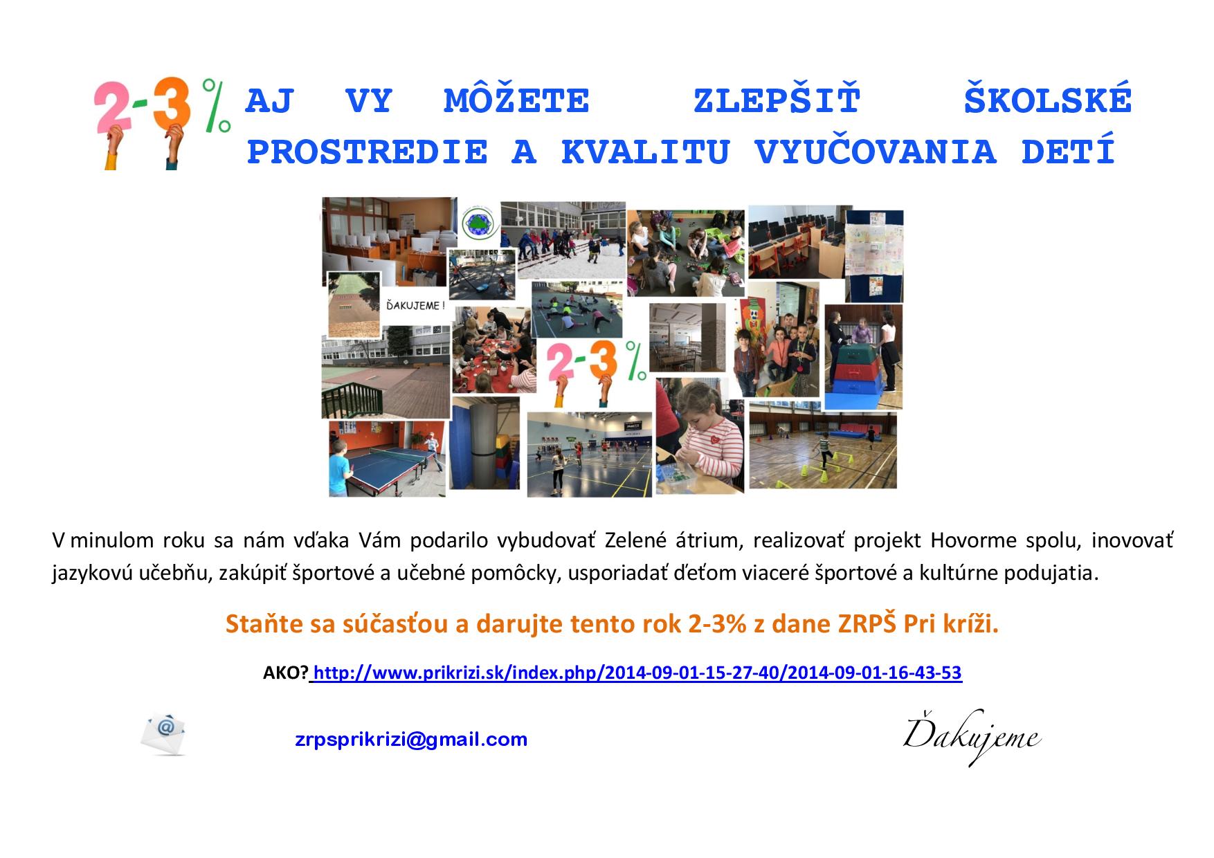 V prípade, že chcete poukázať 3 % dane a zúčastňovali ste sa na brigádach, na školských akciách, či iným spôsobom pomáhali škole, vystavíme Vám potvrdenie po zaslaní mailu na zrpsprikrizi@gmail.com. Tu Vám poskytneme aj pomoc, či poradíme, ak máte k darovaniu akúkoľvek otázku. Bližšie informácie nájdete aj TU.